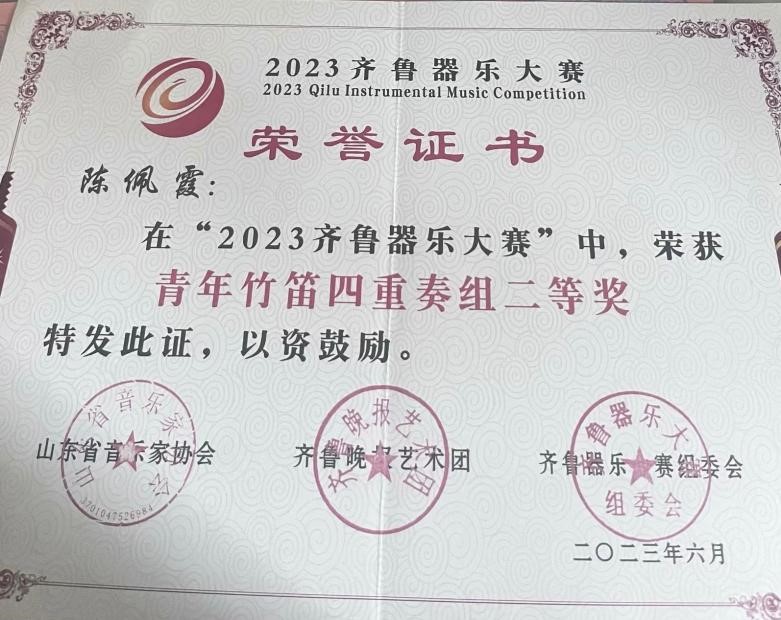 陈佩霞荣获“2023齐鲁器乐大赛”二等奖