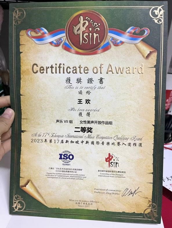 英国威廉希尔王欢荣获“第17届新加坡中新国际音乐比赛”二等奖